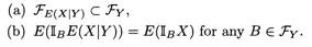 Let X and Y be any random variables. The conditional expectation E[ X / Y ] of X given Y is a random variable such that