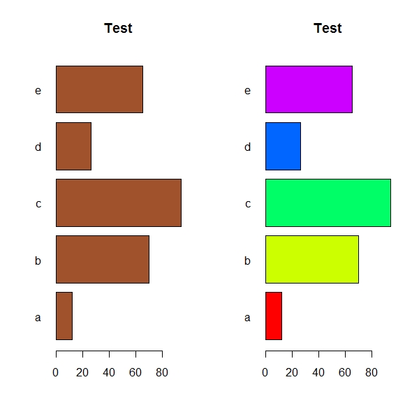 > par(mfrow = c(1, 2)) > barplot(x, las = 1, col = "sienna", main = "Test", horiz = T) > barplot(x, las = 1, col = rainbow(5), main = "Test", horiz = T) |