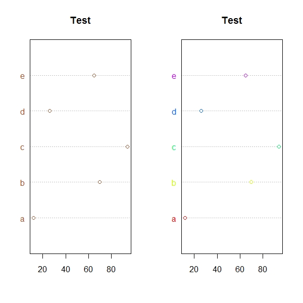 > par(mfrow = c(1, 2)) > dotchart(x, las = 1, col = "sienna", main = "Test") > dotchart(x, las = 1, col = rainbow(5), main = "Test") |