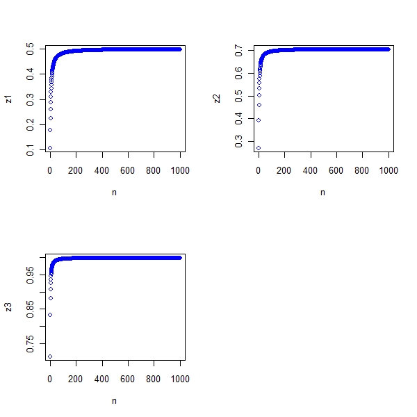 > xs <- c(pi/6, pi/4, pi/2) > n <- 1:1000 > x <- xs[1] > z1 <- cumsum(x^2 * sin(x)/((1 + n * x * x) * (1 + x * x * (n - + 1)))) > x <- xs[2] > z2 <- cumsum(x^2 * sin(x)/((1 + n * x * x) * (1 + x * x * (n - + 1)))) > x <- xs[3] > z3 <- cumsum(x^2 * sin(x)/((1 + n * x * x) * (1 + x * x * (n - + 1)))) > par(mfrow = c(2, 2)) > plot(n, z1, col = "blue") > plot(n, z2, col = "blue") > plot(n, z3, col = "blue") |