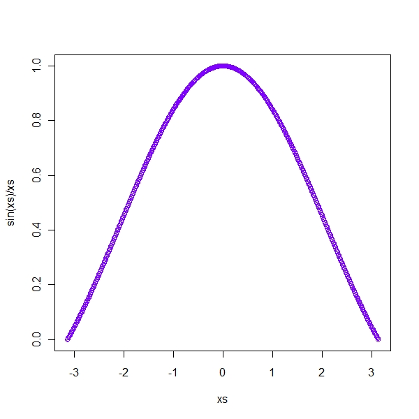 > par(mfrow = c(1, 1)) > cols <- rainbow(4) > plot(xs, z1, col = cols[1], ylim = c(-200, 0)) > par(new = T) > plot(xs, z2, col = cols[2], ylim = c(-200, 0)) > par(new = T) > plot(xs, z3, col = cols[3], ylim = c(-200, 0)) > par(new = T) > plot(xs, z4, col = cols[4]) > plot(xs, sin(xs), col = cols[4]) > plot(xs, sin(xs)/xs, col = cols[4]) |